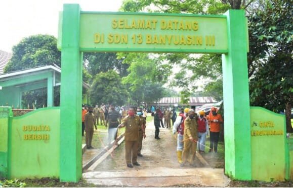Dalam kunjungan ke dua sekolah tersebut. Bupati Banyuasin H Askolani didampingi Wabup H Slamet secara simbolis melakukan penyemprotan disinfektan, meninjau fasilitas cuci tangan, dan ruang sekolah dengan jumlah meja yang dibatasi.