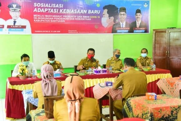 PANGKALAN BALAI — Bupati Banyuasin H.Askolani didampingi Wabup H.Slamet, Hari ini Senin (15/6) mengunjungi SDN 13 Banyuasin III dan SMPN 2 Banyuasin. Hal ini dilaksanakannya dalam rangka Sosialisasi Adaptasi Kebiasaan Baru Menuju masyarakat Produktif dan Aman covid 19 di lingkungan pendidikan dan Kebudayaan Kabupaten Banyuasin.