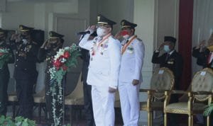 Securitynews.co.di, SEKAYU- Bupati Musi Banyuasin (Muba) Dr H Dodi Reza Alex Noerdin memimpin Upacara Kemerdekaan HUT ke-75 Republik Indonesia, Senin (17/8/2020) dengan protokol kesehatan. Upacara berlangsung di Lapangan Pendopoan Griya Bumi Serasan Sekate berlangsung khitmad.