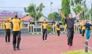 Securitynews.co.id, SEKAYU- Pelaksana Tugas (Plt) Bupati Musi Banyuasin Beni Hernedi SIP bersama Kapolres Muba AKBP Alamsyah Pelupessy berserta jajaran, melaksanakan senam pagi bersama di halaman Polres Muba, Jumat (18/2/2022).