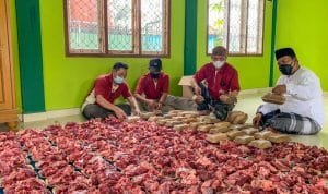 Dirinya menjelaskan bahwa ratusan lebih daging kurban yang disebar kepada masyarakat menggunakan kontainer pelepah daun pinang. “Alhamdulillah sesuai dengan yang kita harapkan pelaksanaan pemotongan hewan kurban ini tepat waktu dan tidak ada warga yang datang untuk berkerumun, sebab sebelumnya panitia juga telah mengimbau kepada masyarakat agar tidak hadir cukup menunggu di rumah, ” ungkapnya.