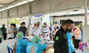 Hadir langsung meninjau kegiatan swab dan vaksinasi Sekretaris Daerah Kab. Muba Drs. H. Apriyadi, M.Si didampingi Kepala Dinas Kesehatan dr. Azmi Dariusmansyah, MARS. Kepala Dinas Perdagangan dan Perindustrian Azizah, S.Sos, MT serta Tim Satgas dari BPBD Muba, Kapolsek Sekayu M. Akib, Koramil Sekayu, Sat Pol PP Muba, Camat Sekayu diwakili Sekcam, Kepala Puskesmas Lumpatan Lismawati dan Kepala UPTD Pasar Yustika.