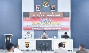Securitynews.co.id, SEKAYU- Menindaklanjuti Instruksi Mendagri No 25 Tahun 2021 tentang pemberlakuan pembatasan kegiatan masyarakat level 4 COVID-19 di wilayah Sumatera, Kalimantan, Sulawesi, Nusa Tenggara, Maluku dan Papua, Pemerintah Kabupaten Musi Banyuasin menggelar Rapat Koordinasi PPKM Level IV, Senin (26/7/2021) di Aula H Alex Noerdin.